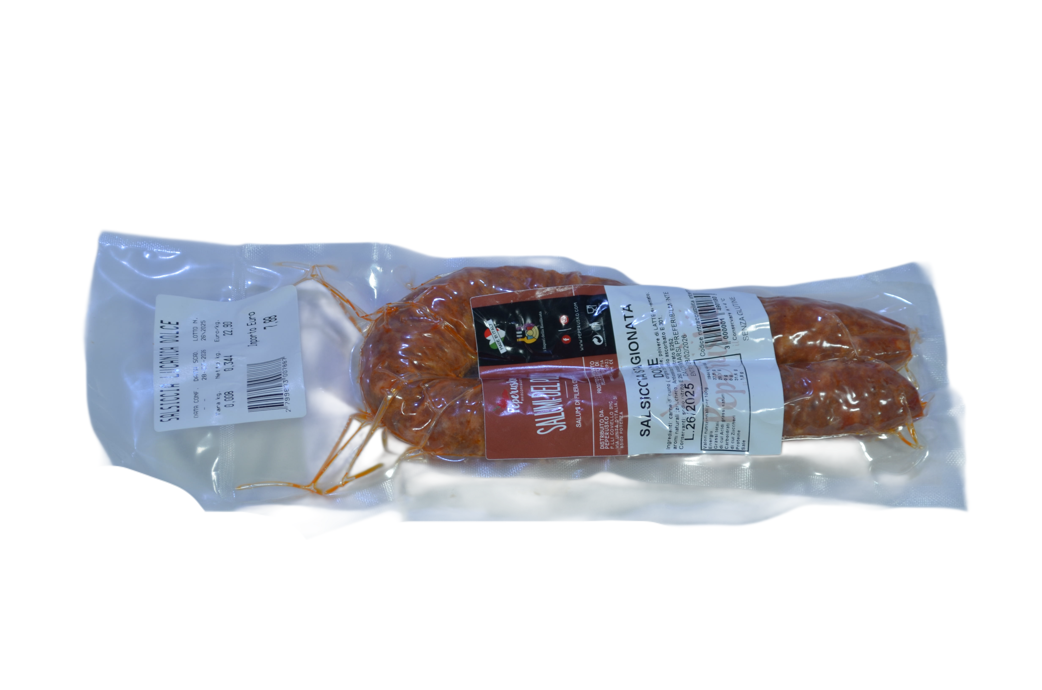 Carne di suino, Sale, Polvere di latte, Aromi naturali (finocchietto selvatico; peperone dolce macinato, esclusivamente della zona di produzione dell’I.G.P. di Senise-PZ, Zucchero, Antiossidante: sodio ascorbato E 301, Conservanti: sodio nitrito E 250, potassio nitrato E 252