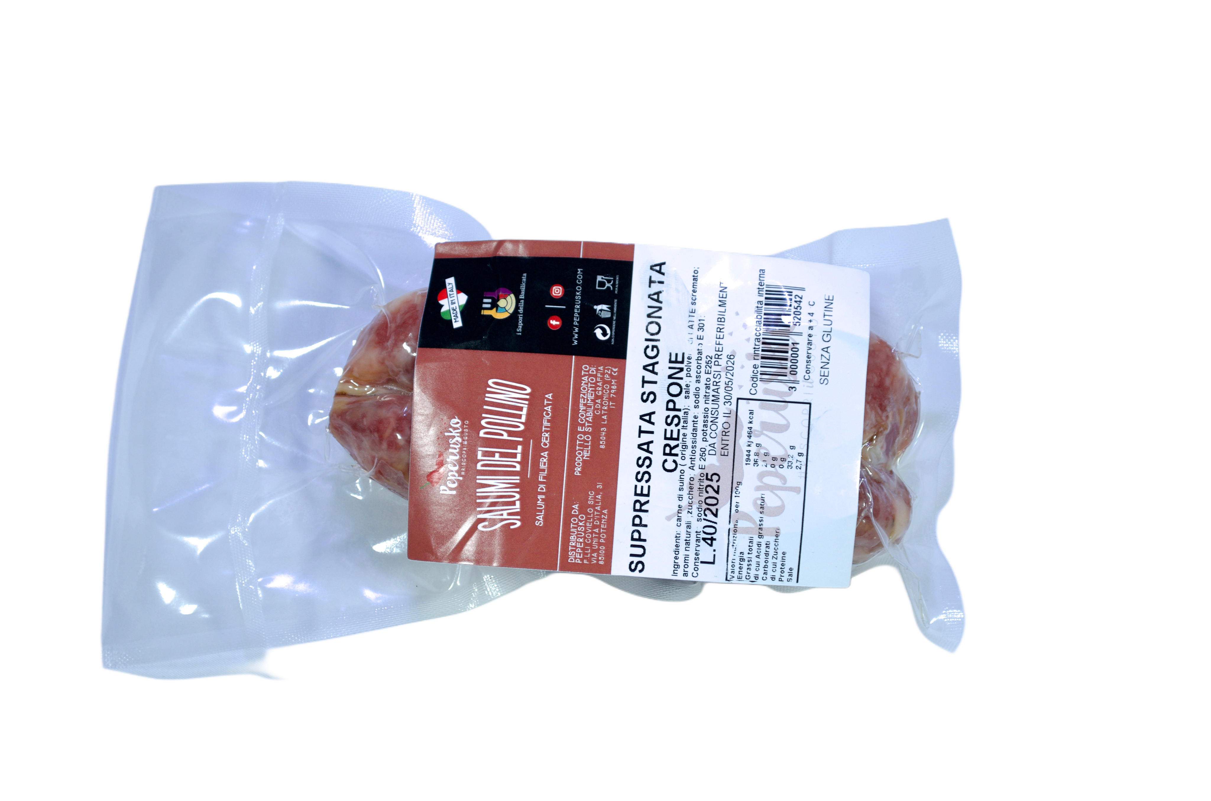 Carne di suino, Sale, Polvere di LATTE scremato, Aromi naturali (finocchietto selvatico; pepe nero intero; peperone dolce macinato, esclusivamente della zona di produzione dell’I.G.P. di Senise-PZ-, con l’aggiunta di peperoncino piccante), Zucchero, Antiossidante: sodio ascorbato E 301, Conservanti: sodio nitrito E 250, potassio nitrato E252