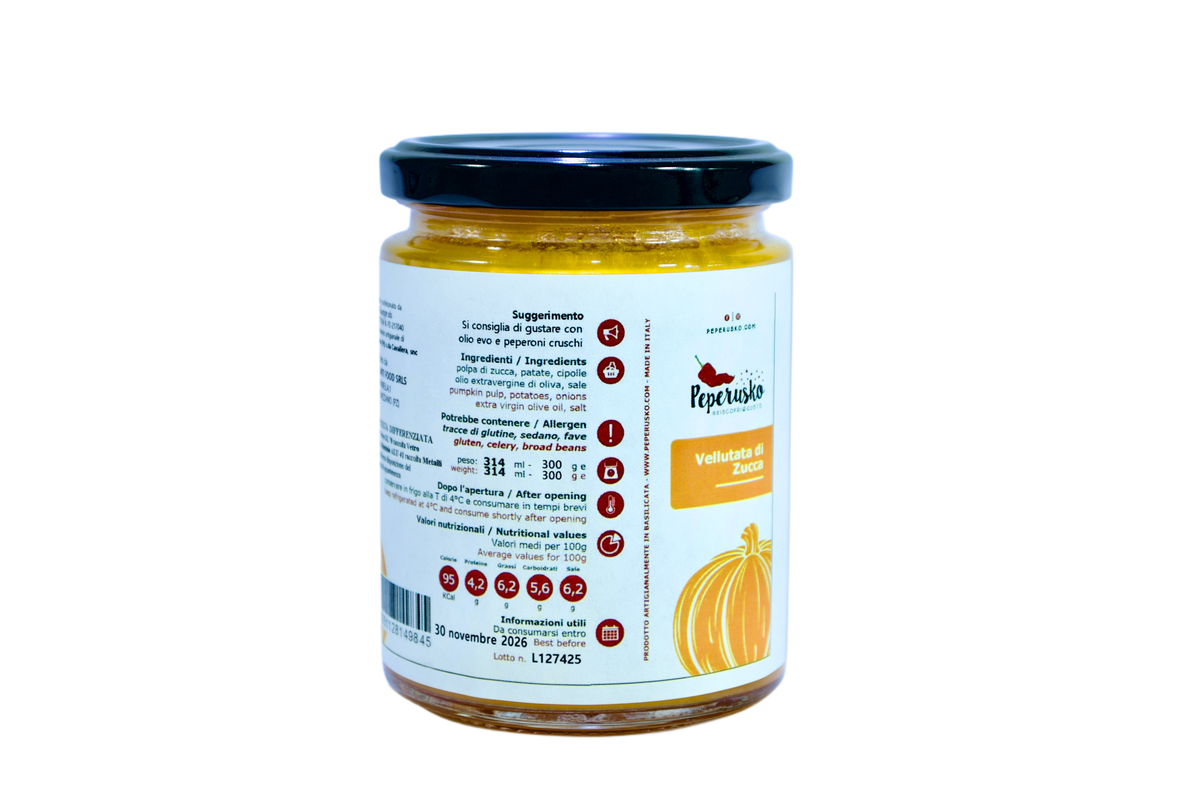 Polpa di zucca, Patate, Cipolle, Olio extravergine di oliva e Sale